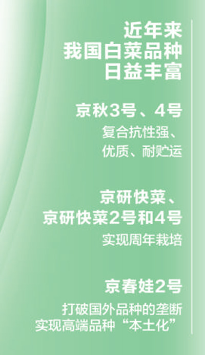 近年來,我國白菜育種實力突飛猛進(jìn),品種日益豐富,實現(xiàn)了從單一“秋播冬貯”向優(yōu)勢產(chǎn)區(qū)生產(chǎn)、產(chǎn)品多樣化和周年生產(chǎn)轉(zhuǎn)變。培育出了復(fù)合抗性強(qiáng)、優(yōu)質(zhì)、耐貯運的品種“京秋3號、4號”等,高品質(zhì)、速生苗用品種“京研快菜、京研快菜2號和4號”3個品種搭配實現(xiàn)了周年栽培,解決了生產(chǎn)上長期缺乏冬春和夏季栽培專用品種的難題。還育成了娃娃菜、快菜、紹菜、金絲白等高品質(zhì)品種,尤其是“京春娃2號”一舉打破國外品種的壟斷,它比國外品種早熟5至7天,種植密度高25%,畝收入增長30%,已成為國產(chǎn)娃娃菜第一大品種,實現(xiàn)了高端品種的“本土化”。