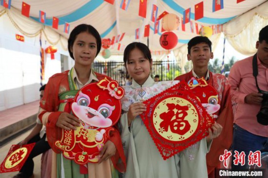 1月19日,“絲路心相通”春節(jié)文化交流活動在茶膠省中柬友好扶貧示范村達弄村活動中心舉辦,學生身穿漢服手拿福字,體驗中國文化。項薪宇 攝