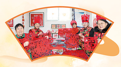 韓淑鳳(左二)帶領(lǐng)村民展示剪紙作品。