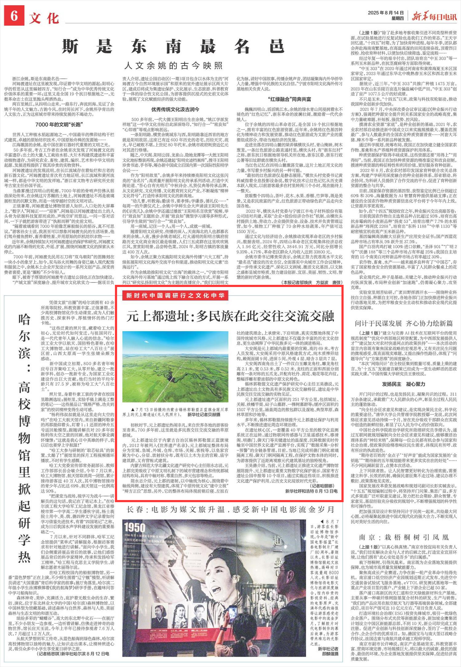 2025年8月14日,《新華每日電訊》第6版刊發(fā)題為《元上都遺址:多民族在此交往交流交融》的文章,報(bào)道了初秋時(shí)節(jié),元上都遺址熱鬧非凡,來自世界各地的游客紛至沓來。元上都遺址出土文物具有多民族文化交融特征,遺址是中華民族交往交流交融的實(shí)物見證。