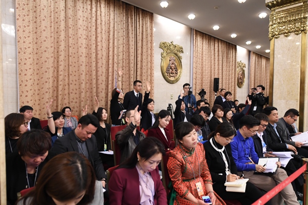 3月6日下午,十三屆全國(guó)人大二次會(huì)議內(nèi)蒙古代表團(tuán)舉行全團(tuán)會(huì)議,審議政府工作報(bào)告并向境內(nèi)外媒體開(kāi)放。來(lái)自17個(gè)國(guó)家和地區(qū)的78家媒體、90名記者到場(chǎng)采訪(fǎng)。內(nèi)蒙古日?qǐng)?bào)社融媒體記者 袁永紅 攝