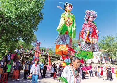6月13日,民間藝人在內(nèi)蒙古2020年“文化和自然遺產(chǎn)日”非遺宣傳展示系列活動開幕式活動現(xiàn)場表演國家級非物質文化遺產(chǎn)“腦閣”。內(nèi)蒙古日報社融媒體記者 王磊 攝