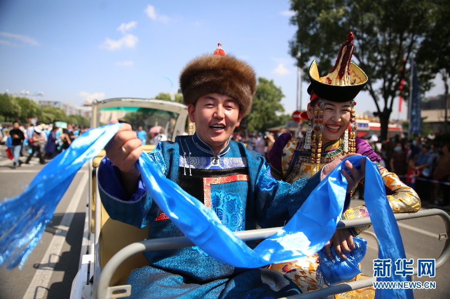 開幕式巡游車上手捧哈達(dá)的群眾代表。新華網(wǎng) 楊騰格爾攝