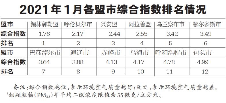 2021年1月,全區(qū)環(huán)境空氣質(zhì)量優(yōu)良天數(shù)比例平均為79.3%,同比提高10.7個(gè)百分點(diǎn)。12個(gè)盟市優(yōu)良天數(shù)比例由高至低依次為:呼倫貝爾市(100.0%)、錫林郭勒盟(100.0%)、興安盟(100.0%)、赤峰市(90.3%)、烏蘭察布市(83.9%)、阿拉善盟(80.6%)、通遼市(77.4%)、鄂爾多斯市(74.2%)、呼和浩特市(67.7%)、包頭市(64.5%)、烏海市(61.3%)和巴彥淖爾市(51.6%)。