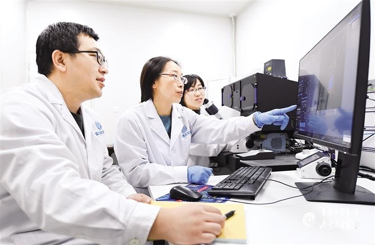 內(nèi)蒙古大學生命科學學院院長、省部共建草原家畜生殖調控與繁育國家重點實驗室主任胡薇(中)與團隊成員觀察動物的成纖維細胞結構形態(tài)。內(nèi)蒙古日報社融媒體記者