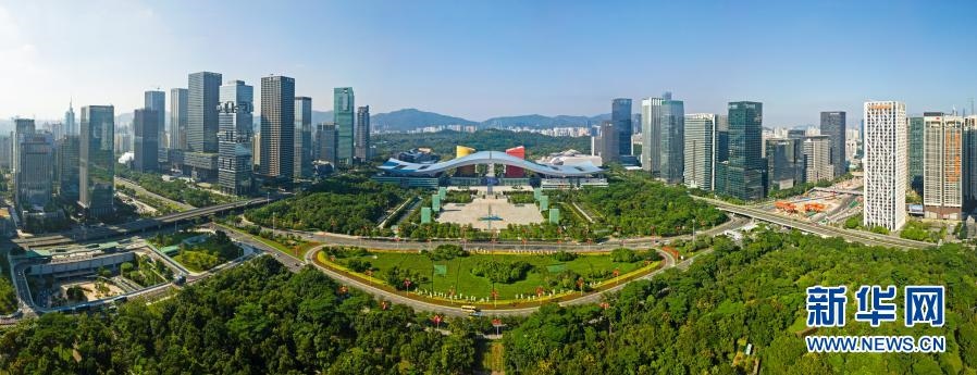 這是2020年10月2日拍攝的深圳市民中心和蓮花山公園一線(無人機(jī)照片)。新華社記者梁旭攝