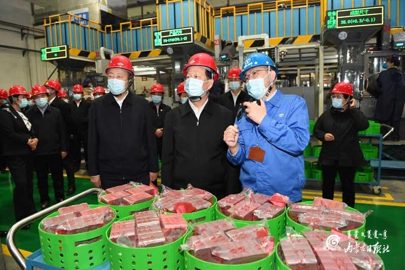 4月22日,自治區(qū)黨委書(shū)記、人大常委會(huì)主任石泰峰,與參加自治區(qū)推動(dòng)高質(zhì)量發(fā)展重大項(xiàng)目建設(shè)動(dòng)員大會(huì)的代表一起觀摩金力永磁(包頭)科技有限公司高性能永磁材料項(xiàng)目。內(nèi)蒙古日?qǐng)?bào)社融媒體記者 袁永紅 攝