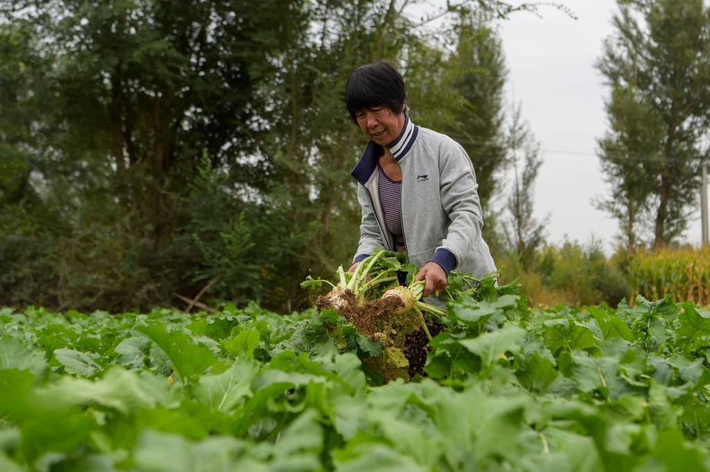 9月26日,達(dá)拉特旗五股地村村民陳玉蓮在菜地勞作。新華社記者 李志鵬攝