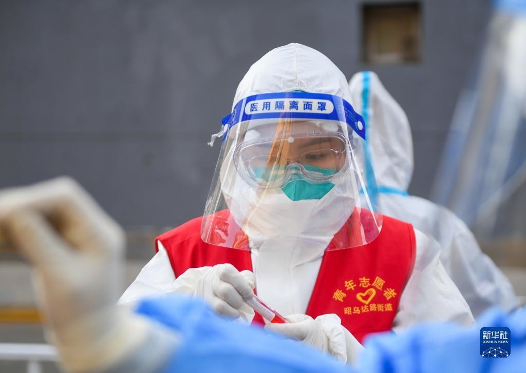 連日來(lái),在呼和浩特市的戰(zhàn)“疫”路上,志愿者沖鋒在前。他們協(xié)助開展核酸檢測(cè)、社區(qū)管控等工作,為筑牢防疫安全屏障貢獻(xiàn)自己的力量。(新華社記者 彭源攝)