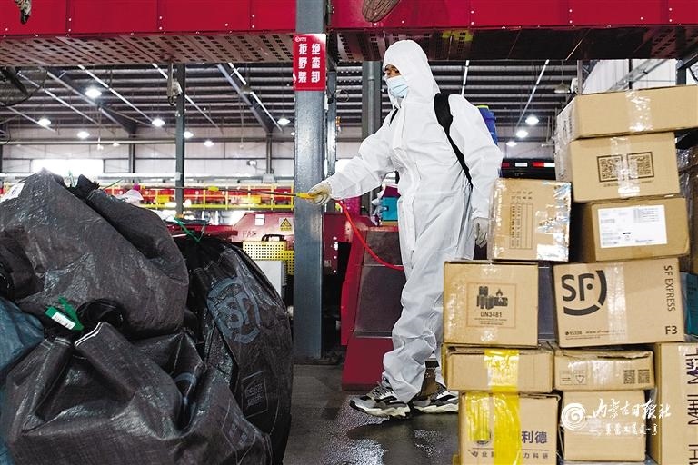 11月18日,內(nèi)蒙古順豐速運(yùn)有限公司呼和浩特市金山分揀中心的工作人員正在對(duì)快遞包裹進(jìn)行消毒。連日來(lái),我區(qū)各快遞企業(yè)加強(qiáng)投遞、攬收等一線從業(yè)人員個(gè)人防護(hù),對(duì)到場(chǎng)地的快遞包裹執(zhí)行每天定時(shí)消殺工作,全力保障每一單快遞的安全。(內(nèi)蒙古日?qǐng)?bào)記者 懷特烏勒斯攝)