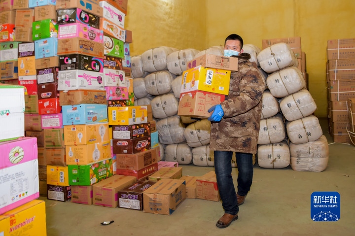 12月7日,在滿洲里市一物資儲(chǔ)備庫,工作人員王永亮在搬運(yùn)物資。新華社記者魏婧宇 攝