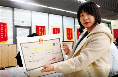 包頭市昆都侖區(qū)實(shí)現(xiàn)“一枚印章管審批”。商戶在展示剛更換的營(yíng)業(yè)執(zhí)照。本報(bào)記者孟和朝魯攝