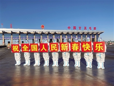1月31日,民警在甘其毛都口岸貨運(yùn)通道祝全國(guó)人民新春快樂。春節(jié)期間,內(nèi)蒙古甘其毛都出入境邊防檢查站民警堅(jiān)守一線,為出入境車輛提供優(yōu)質(zhì)高效的通關(guān)服務(wù),守護(hù)萬(wàn)家燈火。(記者 孟和朝魯 通訊員 宋緒明 攝)