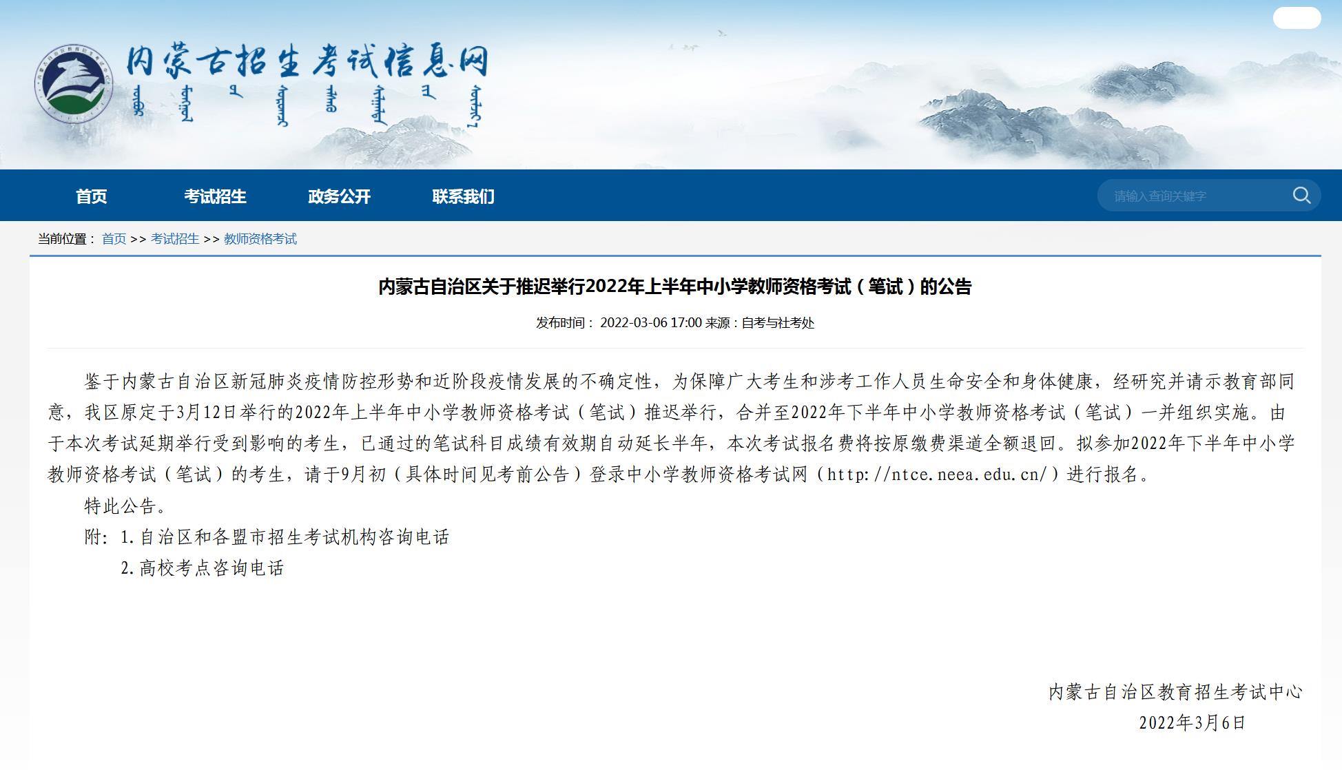 據(jù)內(nèi)蒙古招生考試信息網(wǎng)消息,3月6日,內(nèi)蒙古自治區(qū)教育招生考試中心發(fā)布公告稱,鑒于內(nèi)蒙古自治區(qū)新冠肺炎疫情防控形勢和近階段疫情發(fā)展的不確定性,為保障廣大考生和涉考工作人員生命安全和身體健康,經(jīng)研究并請示教育部同意,原定于3月12日舉行的2022年上半年中小學(xué)教師資格考試(筆試)推遲舉行,合并至2022年下半年中小學(xué)教師資格考試(筆試)一并組織實施。由于本次考試延期舉行受到影響的考生,已通過的筆試科目成績有效期自動延長半年,本次考試報名費將按原繳費渠道全額退回。