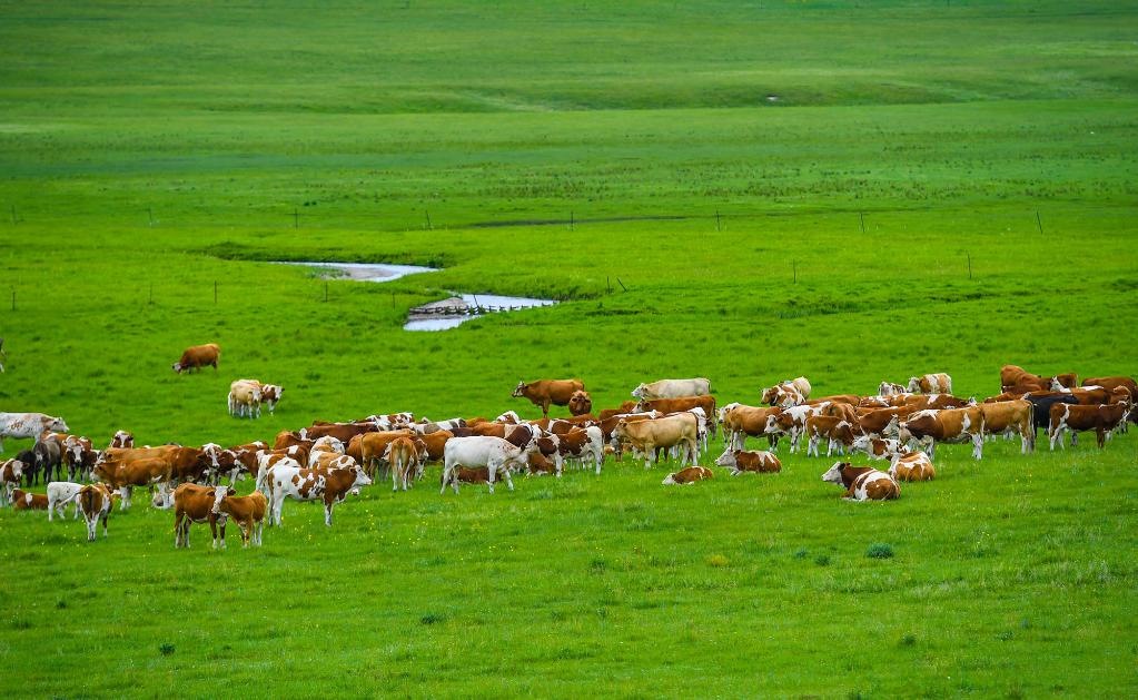 2021年7月15日,牛群在內(nèi)蒙古錫林郭勒盟東烏珠穆沁旗的草原上悠閑覓食。新華社記者彭源攝