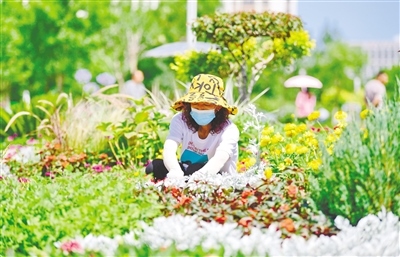 7月13日,工作人員在呼和浩特市草原絲綢之路文化公園維護(hù)、修整花境。據(jù)了解,呼和浩特市園林建設(shè)服務(wù)中心2022年在全市范圍內(nèi)打造19個(gè)花境,目前已全部建設(shè)完成。不同花境采取不同主題,景色錯(cuò)落有致,讓市民們走出家門就可欣賞唯美詩意的生態(tài)花境。(內(nèi)蒙古日報(bào)社融媒體記者 王磊攝)