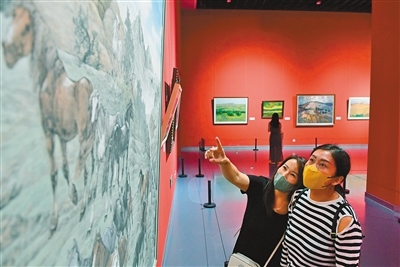 “美麗中國·內(nèi)蒙古形象”主題美術(shù)作品展聚焦“兩個打造”,119幅美術(shù)作品以全區(qū)12個盟市獨特的自然風(fēng)光、人文景觀、生態(tài)面貌為底色,描繪內(nèi)蒙古草之茂、林之郁、湖之美、水之秀、田之沃、沙之魅,全面展示了內(nèi)蒙古真善美的形象。記者 王磊 攝