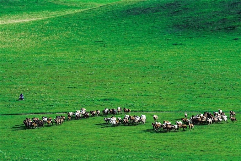 綠韻,疊翠流淌。保生態(tài)、治污染、促轉(zhuǎn)型,讓廣袤草原“帶薪休假”,在興安林?!皰旄d彙保瑢χ攸c沙漠“鎖邊治理”,累計營造林1.22億畝、種草2.86億畝,年均防沙治沙1200萬畝以上,各族兒女義不容辭扛起保護生態(tài)環(huán)境重大責任,厚植“北疆綠”、增色“中國藍”。