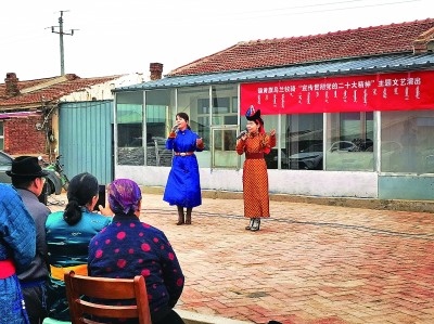 悠揚(yáng)的馬頭琴聲拉開演出序幕,獨(dú)唱、四胡、吉他彈唱等節(jié)目接連上演,贏得大家的陣陣掌聲。隨后隊(duì)員們同牧民群眾圍坐在一起共同學(xué)習(xí)黨的二十大報(bào)告,談心得、話感想。