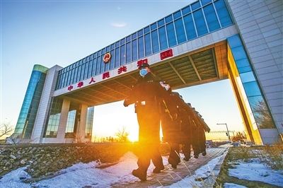 內(nèi)蒙古出入境邊防檢查總站二連出入境邊防檢查站民警在二連浩特國(guó)門(mén)執(zhí)勤巡邏,守護(hù)國(guó)門(mén)安全。郭鵬杰攝
