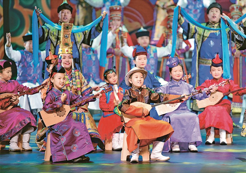 2022年9月4日,第八屆全國(guó)少數(shù)民族曲藝展演在內(nèi)蒙古自治區(qū)鄂爾多斯市開(kāi)演。圖為演員在展演中表演蒙古族祝贊詞《禮贊新時(shí)代》。 人民圖片