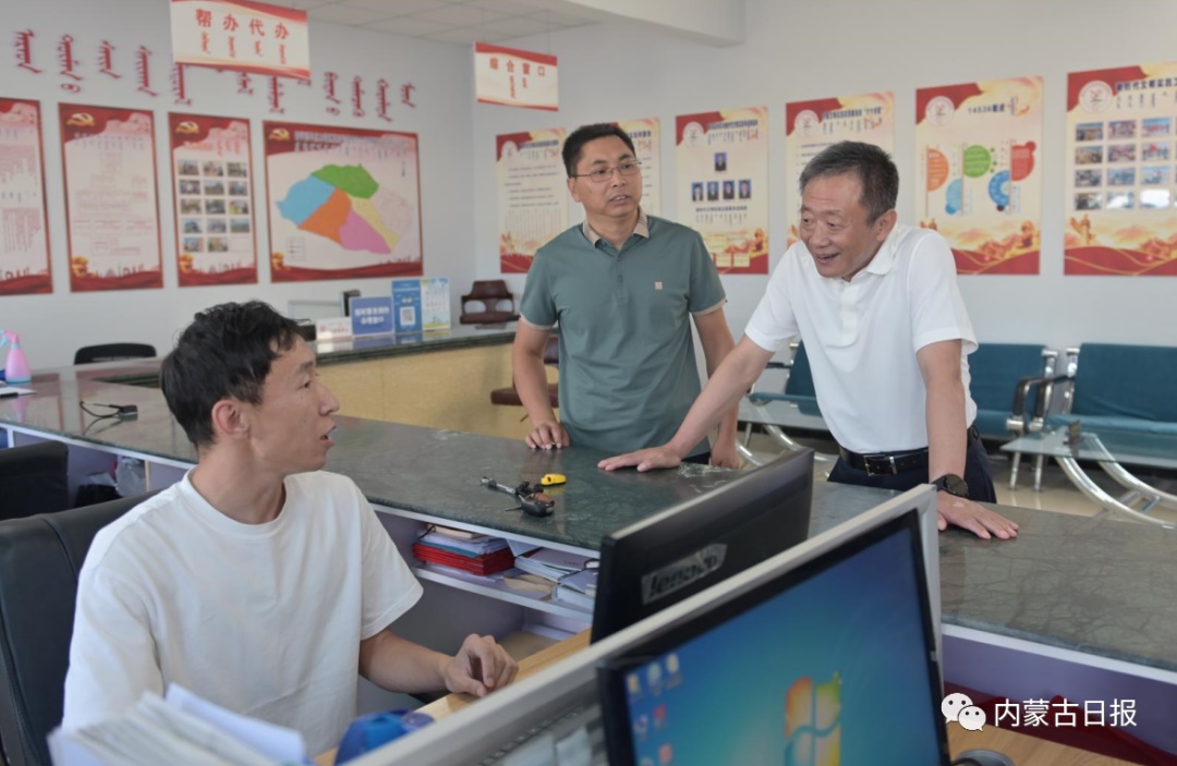 8月13日,自治區(qū)黨委書記孫紹騁在蘇尼特左旗賽罕高畢蘇木黨群服務(wù)中心與窗口工作人員深入交流。內(nèi)蒙古日?qǐng)?bào)社融媒體記者 馬建荃 攝