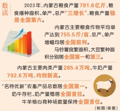 數(shù)字是發(fā)展最好的注腳。過(guò)去一年,內(nèi)蒙古緊扣“地、水、種”和“糧、肉、奶”6個(gè)重點(diǎn),全力推動(dòng)糧食單產(chǎn)再提高、牲畜養(yǎng)殖再增效,不斷擴(kuò)大數(shù)量、提高質(zhì)量、增加產(chǎn)量,努力把國(guó)家重要農(nóng)畜產(chǎn)品生產(chǎn)基地建設(shè)得量大質(zhì)優(yōu),切實(shí)當(dāng)好國(guó)家糧食安全“壓艙石”。