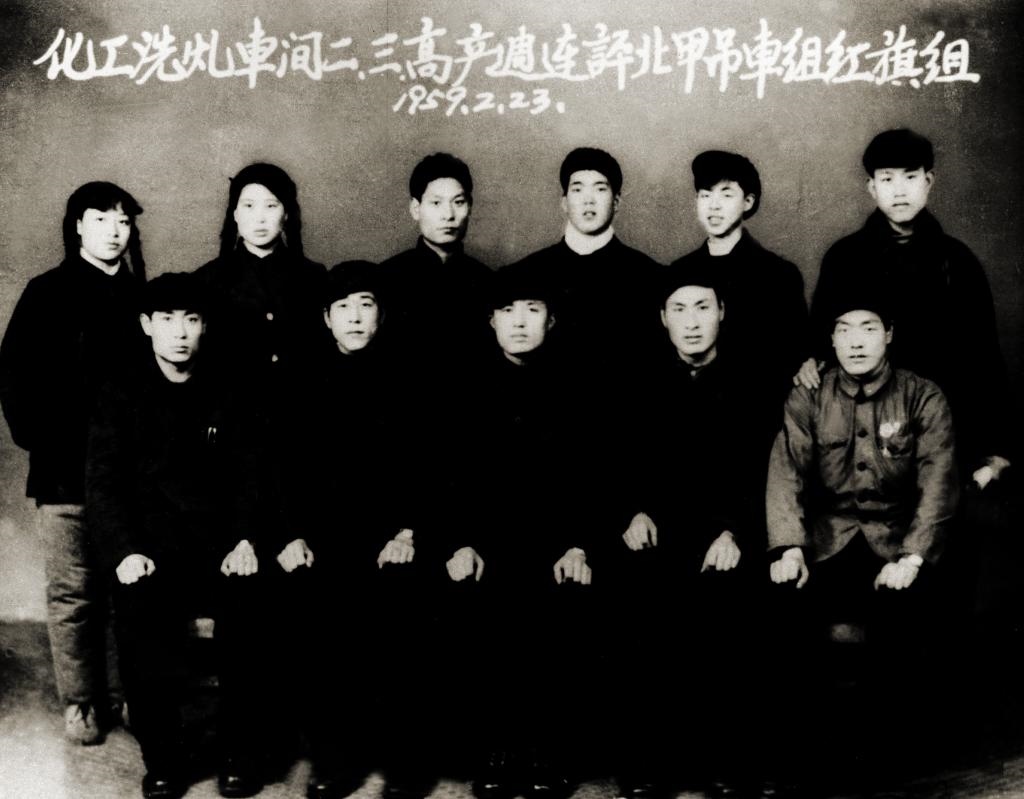 ↑1959年2月,雷鋒所在鞍鋼洗煤車間吊車組被評為紅旗組,這是雷鋒(后排右二)和工友合影。