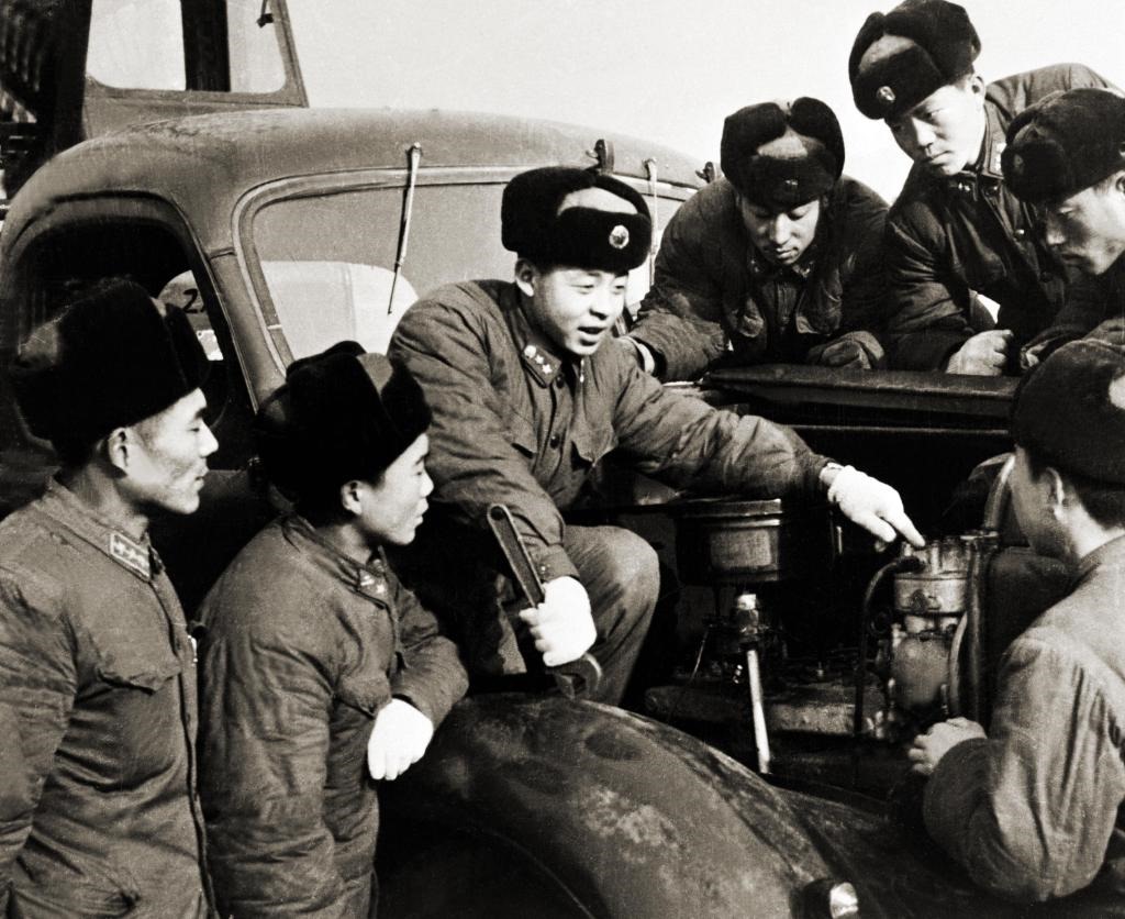 ↑雷鋒(左三)在向戰(zhàn)友們介紹節(jié)油經(jīng)驗。