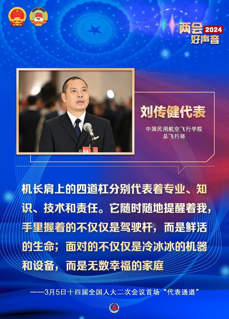 劉傳健說(shuō):“機(jī)長(zhǎng)肩上的四道杠分別代表著專業(yè)、知識(shí)、技術(shù)和責(zé)任。它隨時(shí)隨地提醒著我,手里握著的不僅僅是駕駛桿,而是鮮活的生命;面對(duì)的不僅僅是冷冰冰的機(jī)器和設(shè)備,而是無(wú)數(shù)幸福的家庭?!?/p>