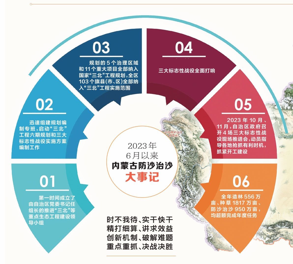7月底,鄂爾多斯市率先打響黃河“幾字彎”攻堅戰(zhàn);8月12日,赤峰市打響科爾沁、渾善達克兩大沙地殲滅戰(zhàn)“第一槍”;11月初,自治區(qū)打響河西走廊—塔克拉瑪干沙漠邊緣阻擊戰(zhàn)。