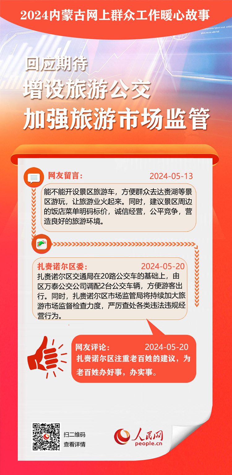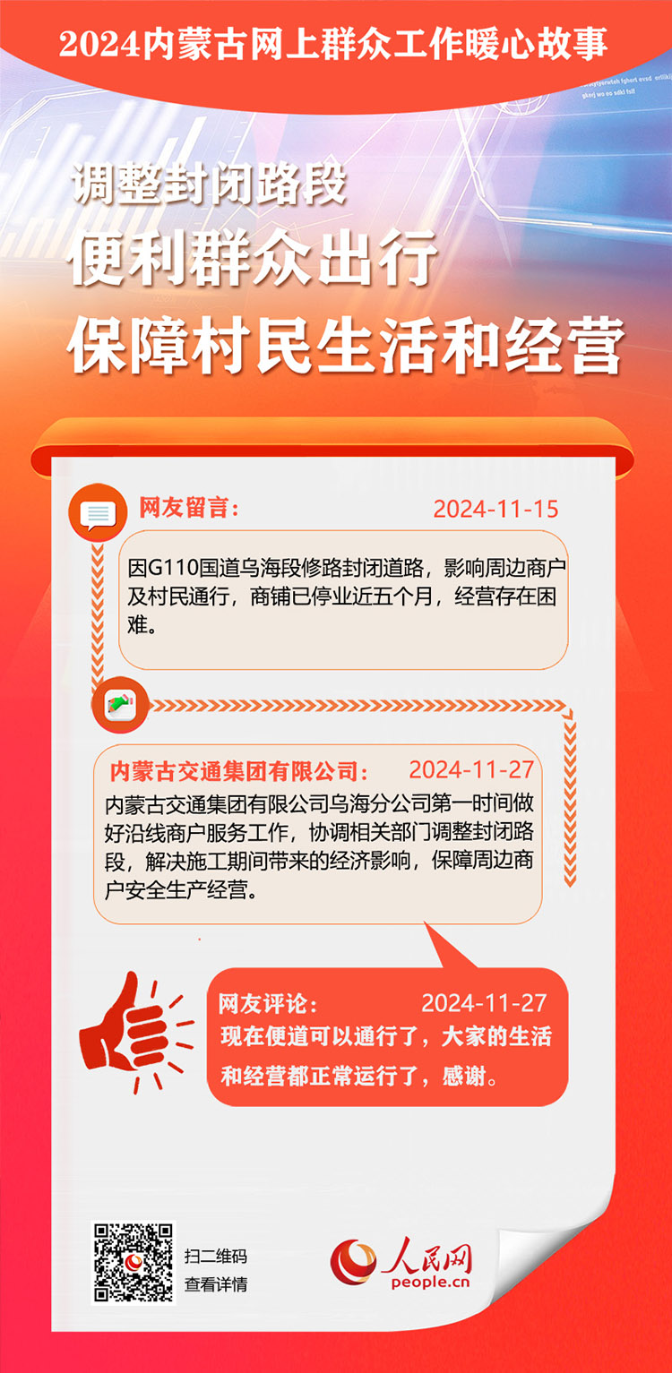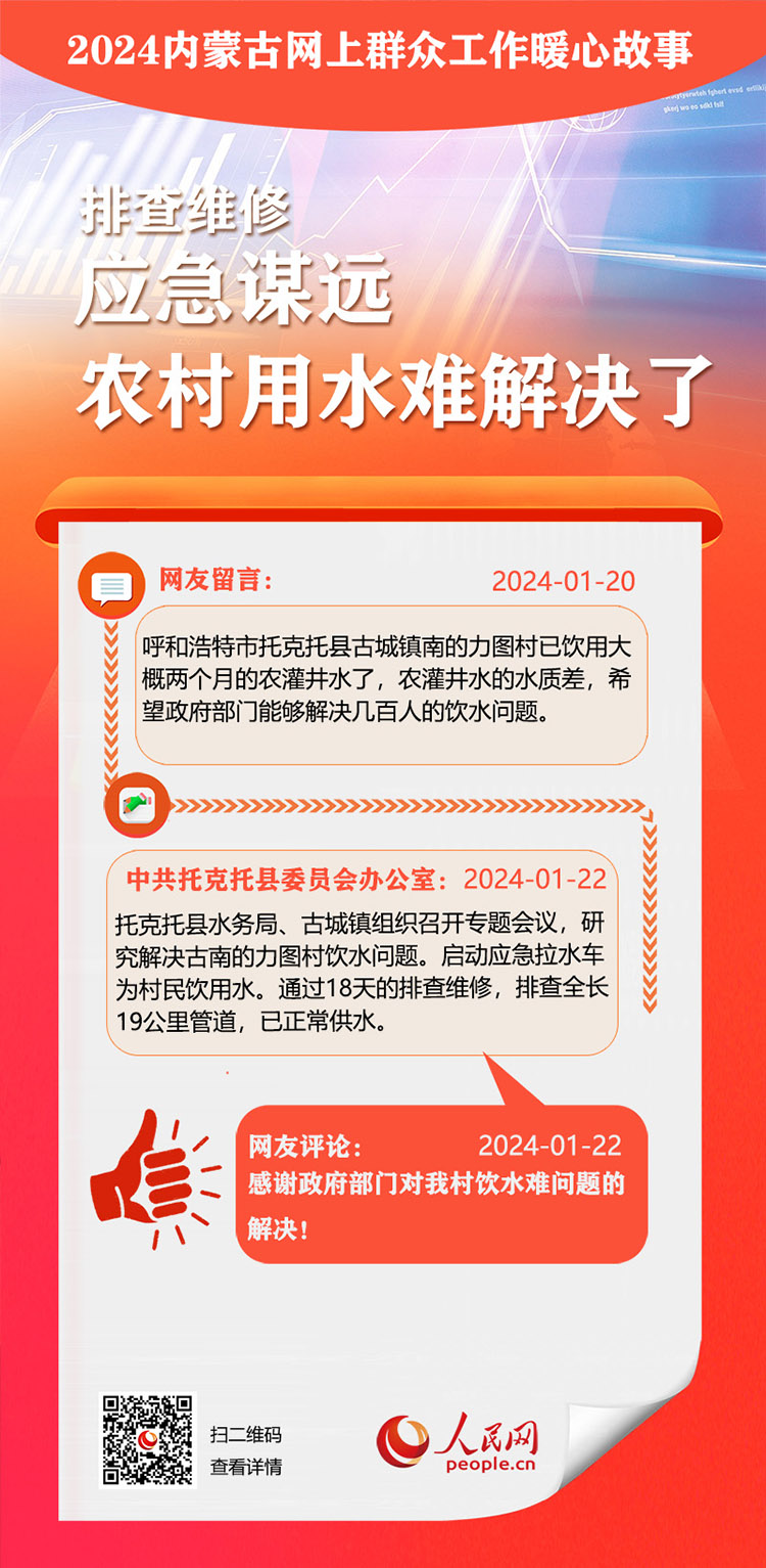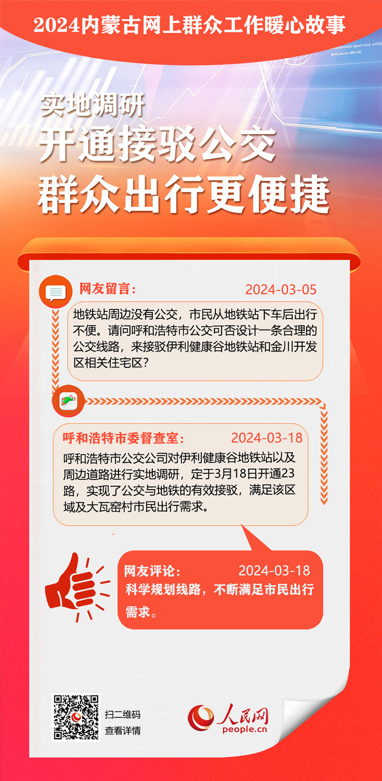 走好走實(shí)網(wǎng)上群眾路線 用心用情為民服務(wù)辦實(shí)事。依托人民網(wǎng)“領(lǐng)導(dǎo)留言板”,內(nèi)蒙古自治區(qū)各級黨委、政府著力解決網(wǎng)民反映的熱點(diǎn)難點(diǎn)。2024年,一批群眾關(guān)切的急難愁盼問題得到及時(shí)解決。人民網(wǎng)內(nèi)蒙古頻道推出特別策劃,盤點(diǎn)過去一年內(nèi)蒙古網(wǎng)上群眾工作那些暖心事?!?/p>