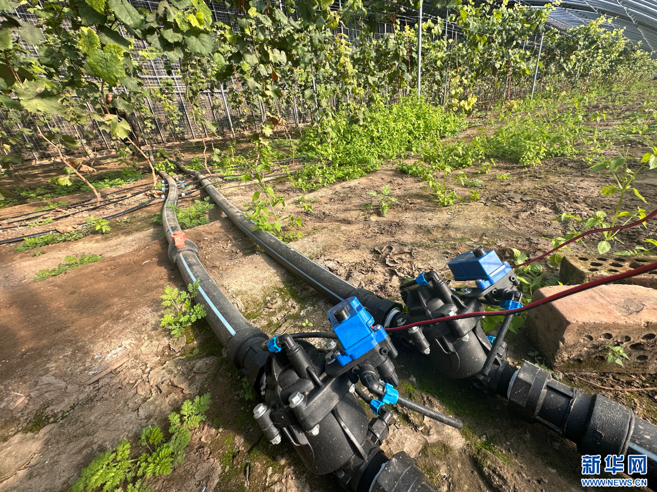 ??包頭市東河區(qū)沙爾沁一村果路農(nóng)業(yè)葡萄種植基地溫室里,通過(guò)管道輸送葡萄樹(shù)苗所需營(yíng)養(yǎng)成份。新華網(wǎng)發(fā)(張建芳 攝)