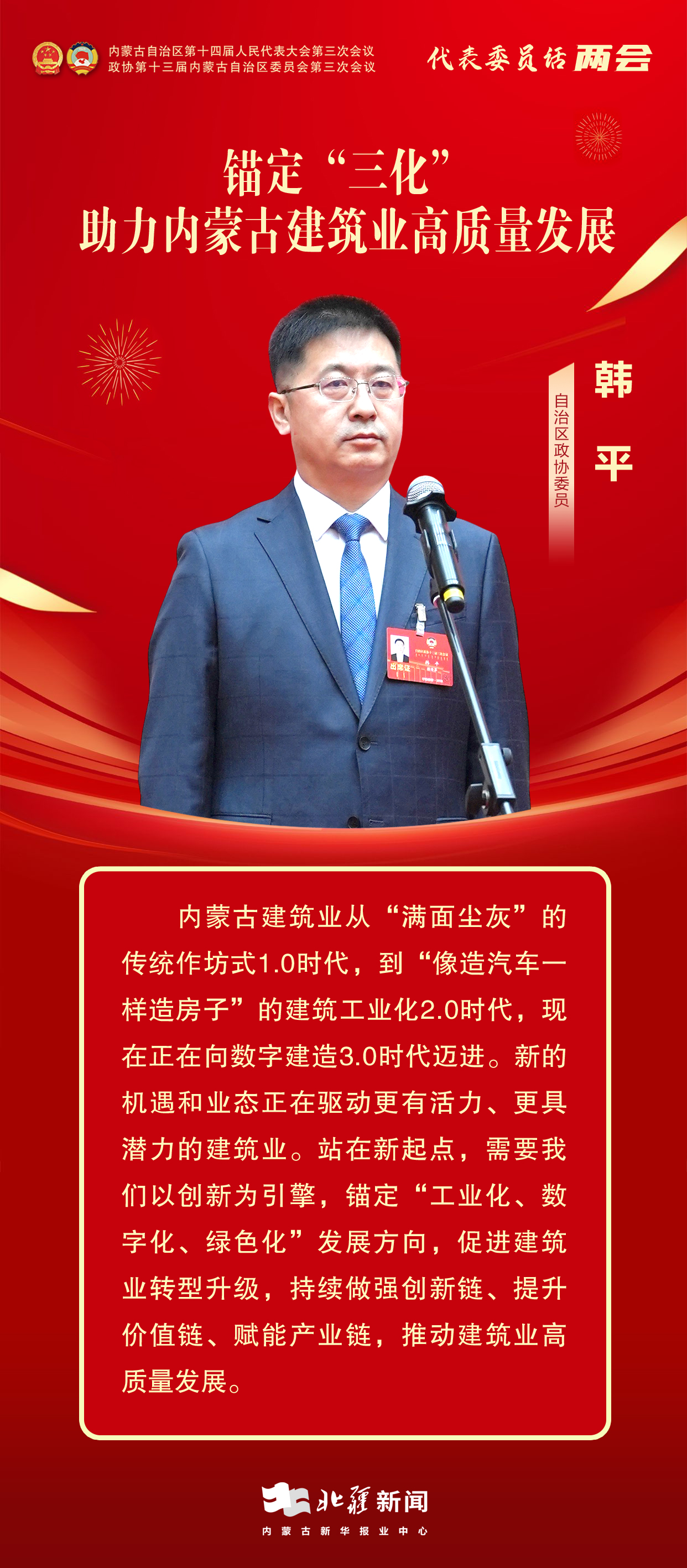 北疆新聞呼和浩特1月13日電(記者 張?chǎng)?李姝廷)委員通道,通民心、道發(fā)展。1月13日上午,自治區(qū)兩會(huì)首場(chǎng)“委員通道”正式開啟。自治區(qū)政協(xié)委員,興泰建設(shè)集團(tuán)有限公司黨委書記、董事長韓平圍繞“建筑業(yè)高質(zhì)量發(fā)展”的內(nèi)容建真言、獻(xiàn)良策。