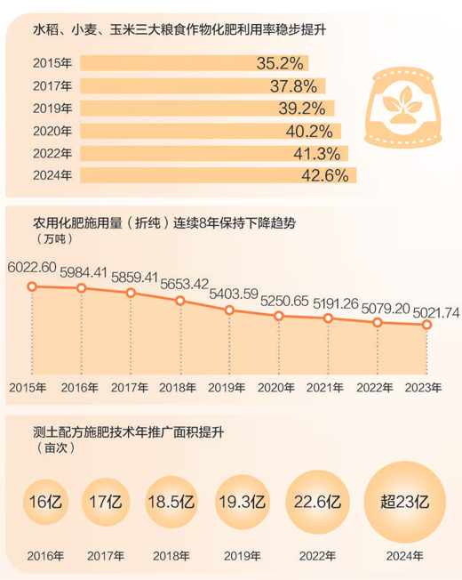 2024年,我國水稻、小麥、玉米三大糧食作物化肥利用率為42.6%,比2022年提高1.3個百分點?;世寐?,即化肥被作物吸收利用的比例,反映了化肥在農業(yè)生產中的有效利用程度。科學施肥效果提升,折射農業(yè)發(fā)展方式之變。