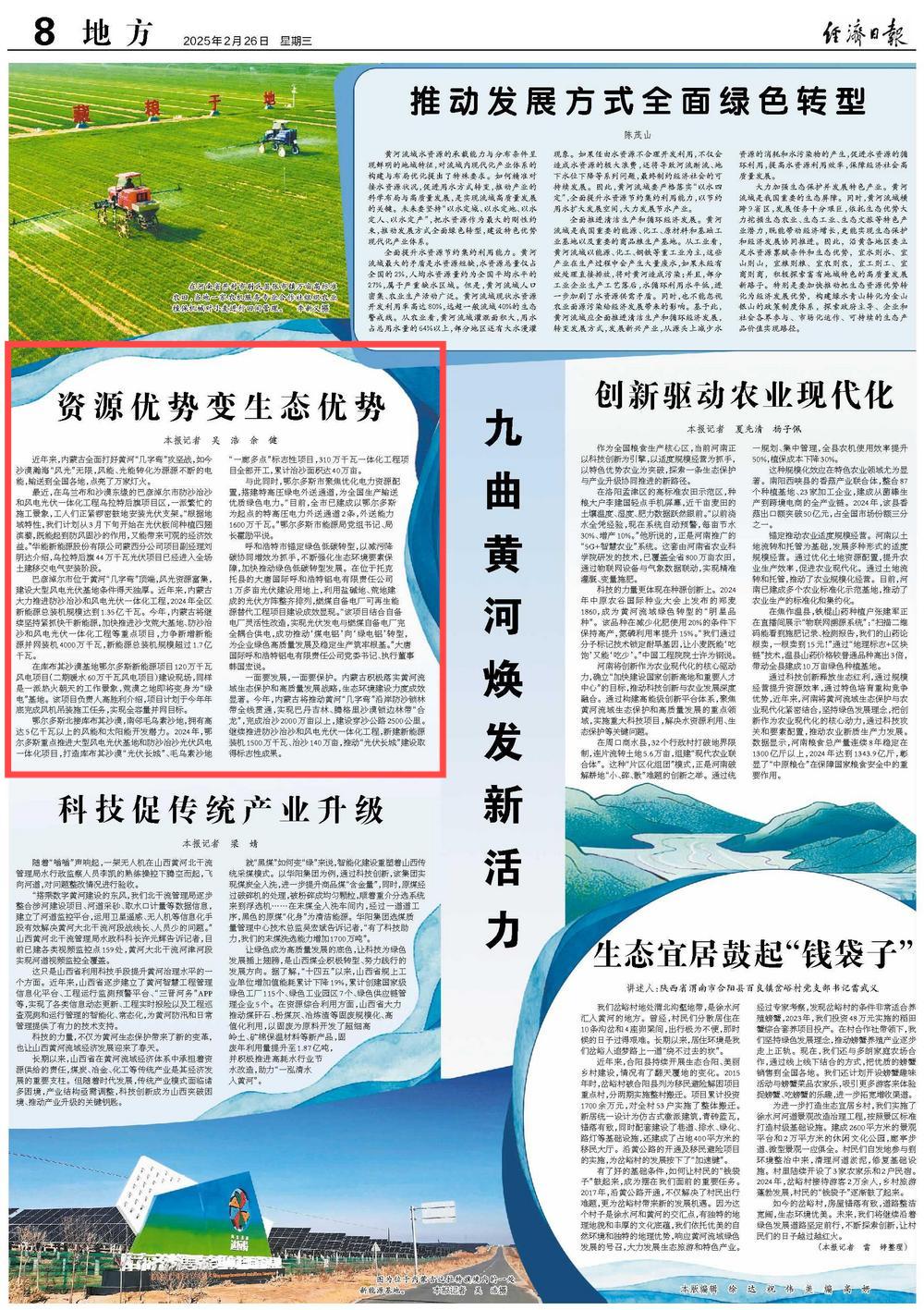 2025年2月26日,《經(jīng)濟日報》第8版刊發(fā)題為《資源優(yōu)勢變生態(tài)優(yōu)勢》的文章,報道了近年來,內(nèi)蒙古全面打好黃河“幾字彎”攻堅戰(zhàn),如今沙漠瀚?!帮L光”無限,風能、光能轉(zhuǎn)化為源源不斷的電能,輸送到全國各地,點亮了萬家燈火。