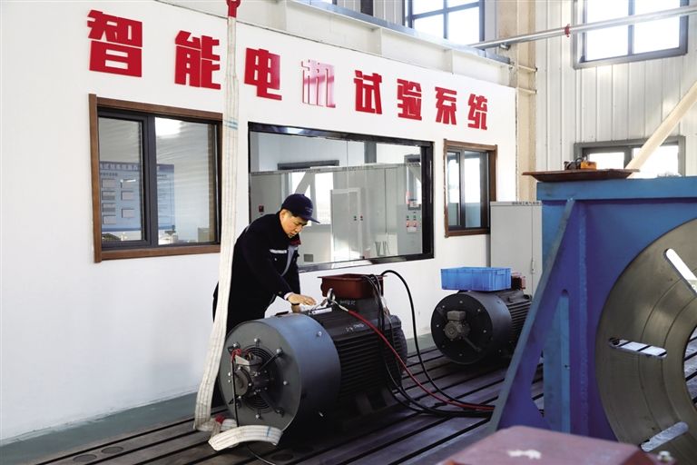 內(nèi)蒙古優(yōu)普森電氣有限公司生產(chǎn)車間內(nèi)一臺永磁電機(jī)正在進(jìn)行出廠前試驗(yàn)。 記者 劉向平 攝