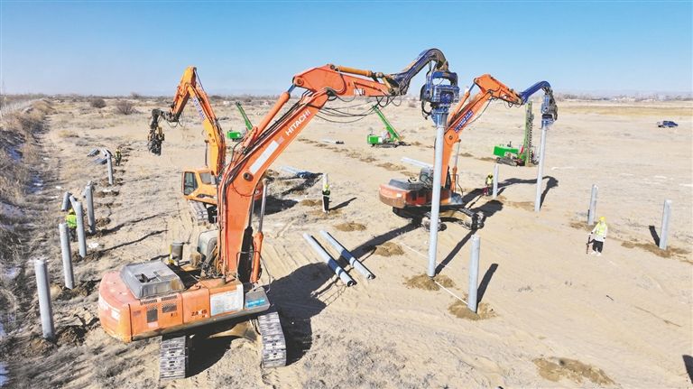 引孔機(jī)、打樁機(jī)轟鳴聲不絕于耳,打樁機(jī)將一根根水泥樁“釘”入地面中……連日來,巴彥淖爾市臨河區(qū)新華林場防沙治沙和光伏一體化項(xiàng)目施工現(xiàn)場多臺作業(yè)車輛同時(shí)進(jìn)行樁基作業(yè),現(xiàn)場還不時(shí)有工作人員對打樁等基礎(chǔ)工作進(jìn)行抽檢抽查,確保施工質(zhì)量。