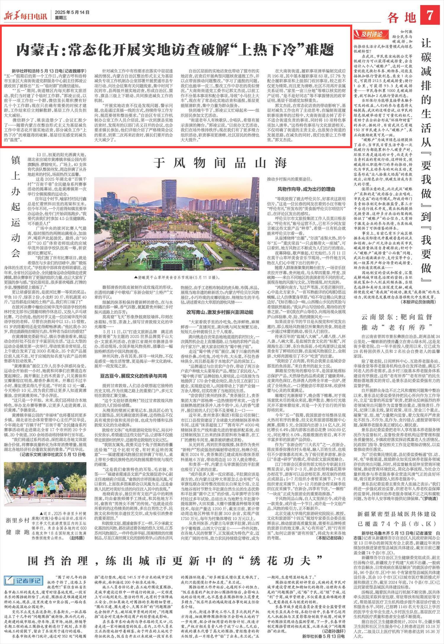 2025年5月14日《新華每日電訊》第7版刊發(fā)了《內(nèi)蒙古:常態(tài)化開展實地訪查破解“上熱下冷”難題》的文章,報道了內(nèi)蒙古自治區(qū)整治形式主義為基層減負(fù)專項工作機制辦公室部署開展貫通市縣專項行動,向社會征集有關(guān)問題線索,集中時間下沉到市、縣兩級開展實地訪查,形成自治區(qū)、盟市、旗縣三級上下聯(lián)動、共同推進減負(fù)工作的機制。