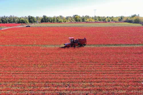 圖為開魯縣東風(fēng)鎮(zhèn)辣椒種植基地進(jìn)行機(jī)收作業(yè)的情景。張芮嘉 攝