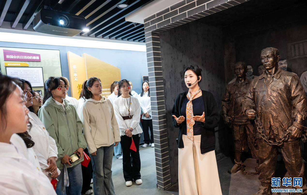 ??10月1日,內(nèi)蒙古師范大學(xué)馬克思主義學(xué)院的學(xué)子們?cè)跉w化城展示館參觀研學(xué)。新華網(wǎng)發(fā)(丁根厚 攝)