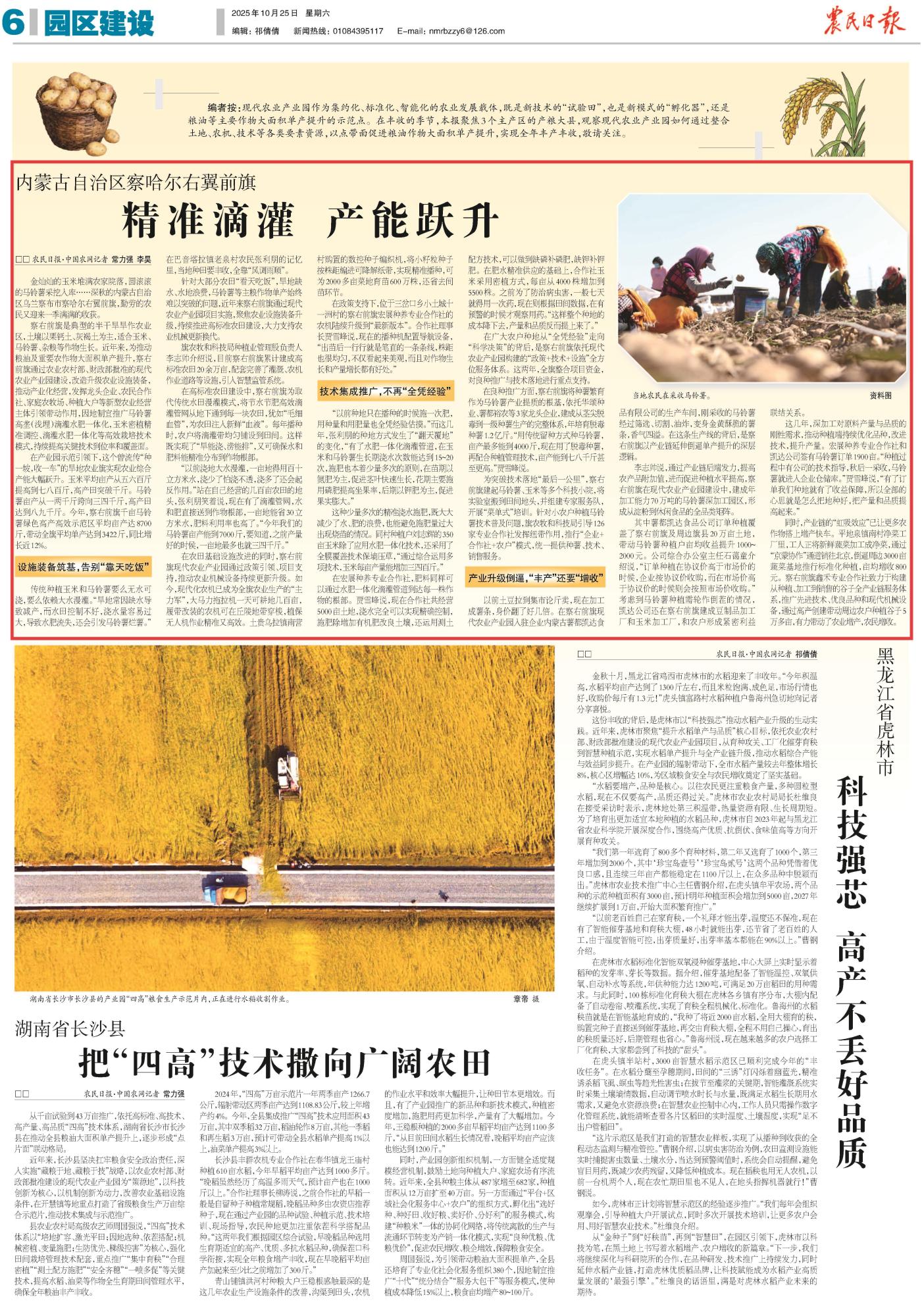 2025年10月25日,《農(nóng)民日報(bào)》第6版刊發(fā)題為《內(nèi)蒙古自治區(qū)察哈爾右翼前旗:精準(zhǔn)滴灌 產(chǎn)能躍升》的文章,報(bào)道了內(nèi)蒙古烏蘭察布市察哈爾右翼前旗通過現(xiàn)代農(nóng)業(yè)產(chǎn)業(yè)園推廣滴灌水肥一體化等技術(shù),推動玉米、馬鈴薯單產(chǎn)大幅提升,成功實(shí)現(xiàn)從“靠天吃飯”到科技增收的轉(zhuǎn)變。