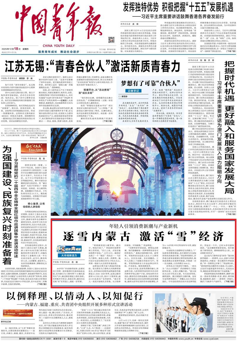 2025年12月18日《中國青年報》第1版刊發(fā)了《大市場新活力 年輕人引領(lǐng)消費新潮與產(chǎn)業(yè)新機 逐雪內(nèi)蒙古 激活“雪”經(jīng)濟(jì)》的文章,報道了烏蘭察布大河灣滑雪場是打造“冰雪+”復(fù)合體驗的縮影——將滑雪、火山、民俗與草原深度綁定,串聯(lián)成一條完整的冬季體驗鏈。