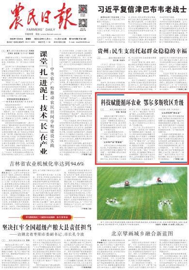 2026年1月29日,《農(nóng)民日?qǐng)?bào)》頭版刊發(fā)題為《科技賦能循環(huán)農(nóng)業(yè) 鄂爾多斯牧區(qū)升級(jí)》的文章,報(bào)道了在內(nèi)蒙古鄂爾多斯市祖祖輩輩“靠天吃飯、逐水草而居”的傳統(tǒng)被改寫,取而代之的是科技賦能的精細(xì)化種養(yǎng),是貫通三產(chǎn)的新興業(yè)態(tài)。越來越多的農(nóng)牧民,正沿著“新一產(chǎn)”鋪就的這條路,走向收入更穩(wěn)、底氣更足的好日子。