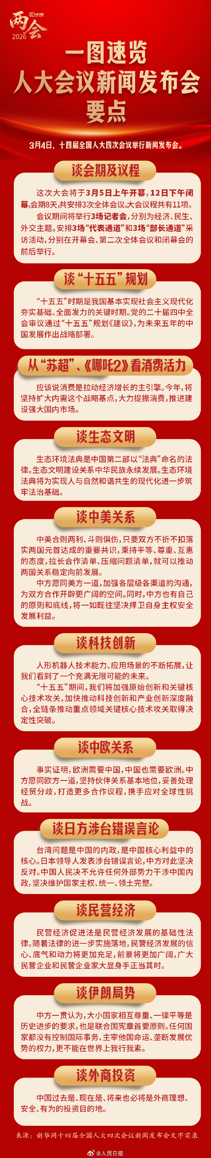 3月4日,十四屆全國(guó)人大四次會(huì)議舉行新聞發(fā)布會(huì)。從蘇超、《哪吒2》到人形機(jī)器人,從回應(yīng)中美關(guān)系到日方涉臺(tái)錯(cuò)誤言論……人大會(huì)議新聞發(fā)布會(huì)說(shuō)了啥?一圖速覽人大會(huì)議新聞發(fā)布會(huì)要點(diǎn)↓↓