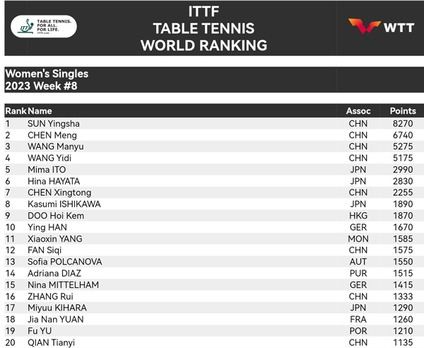 女單排名 圖片來(lái)源:國(guó)際乒聯(lián)官網(wǎng)