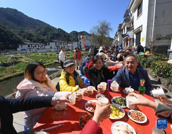 2月26日,游客們?cè)谏徎ㄦ?zhèn)戴家新村的百家宴上品嘗特色美食。