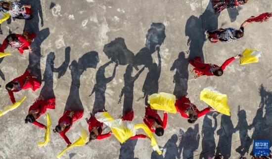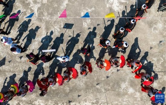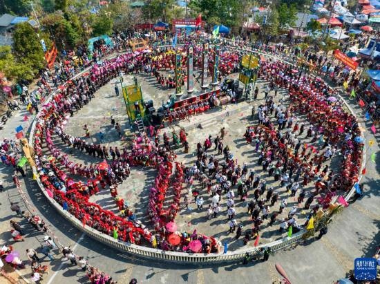 3月2日,當(dāng)?shù)厝罕娕c來自各地的游客踩著相同的鼓點(diǎn)進(jìn)場(chǎng)舞蹈(無人機(jī)照片)。