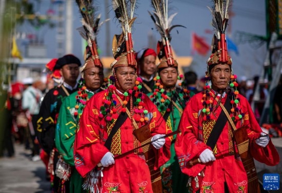 3月2日,參加目瑙縱歌節(jié)的當(dāng)?shù)厝罕娺M(jìn)場(chǎng)舞蹈。