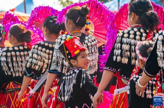 3月2日,參加目瑙縱歌節(jié)的小朋友跟著大人們一起進(jìn)場(chǎng)舞蹈。
